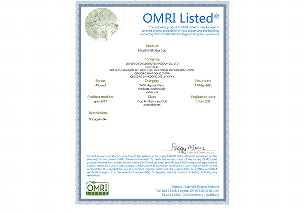 美國(guó)OMRI有機(jī)認(rèn)證證書