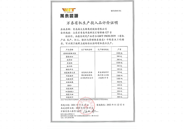 萬泰有機(jī)生產(chǎn)投入品評(píng)價(jià)證明